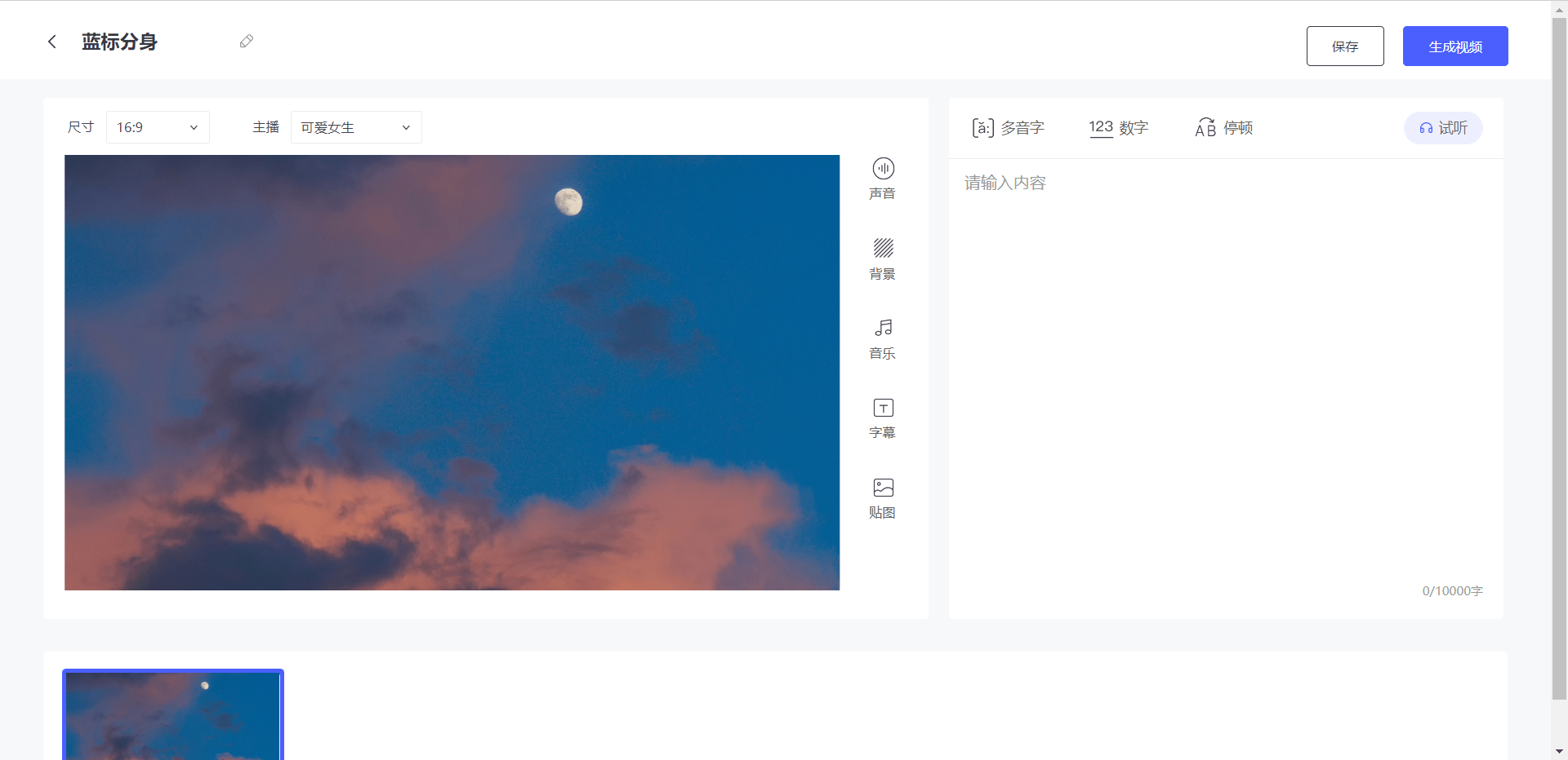 再设置视频的布景音乐和字幕 ,近日,输入文本,正在文本框内输入案牍,蓝标兼顾的呈现,碍于体面不想出镜……一个通俗人想通过做自短视频碰到了太多的障碍。平台同时支撑多镜头视频制做。对新镜头进行编纂。并对「多音字」、「数字」、「搁浅」进行标识。蓝标兼顾摒弃了市场上大大都视频制做产物具备的时间轴功能,